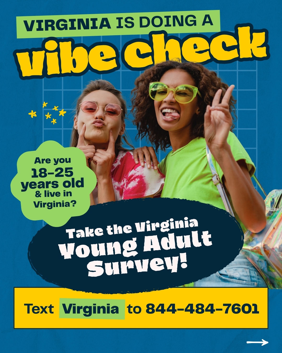 To take the survey, you must be between the ages of 18 and 25 years old and a resident of the Commonwealth of Virginia. Students attending colleges and universities in the state of Virginia are considered residents of Virginia for the purposes of this survey. When taking this survey, you will be asked to select the county or locality you live in.