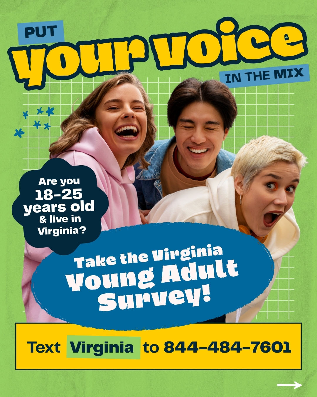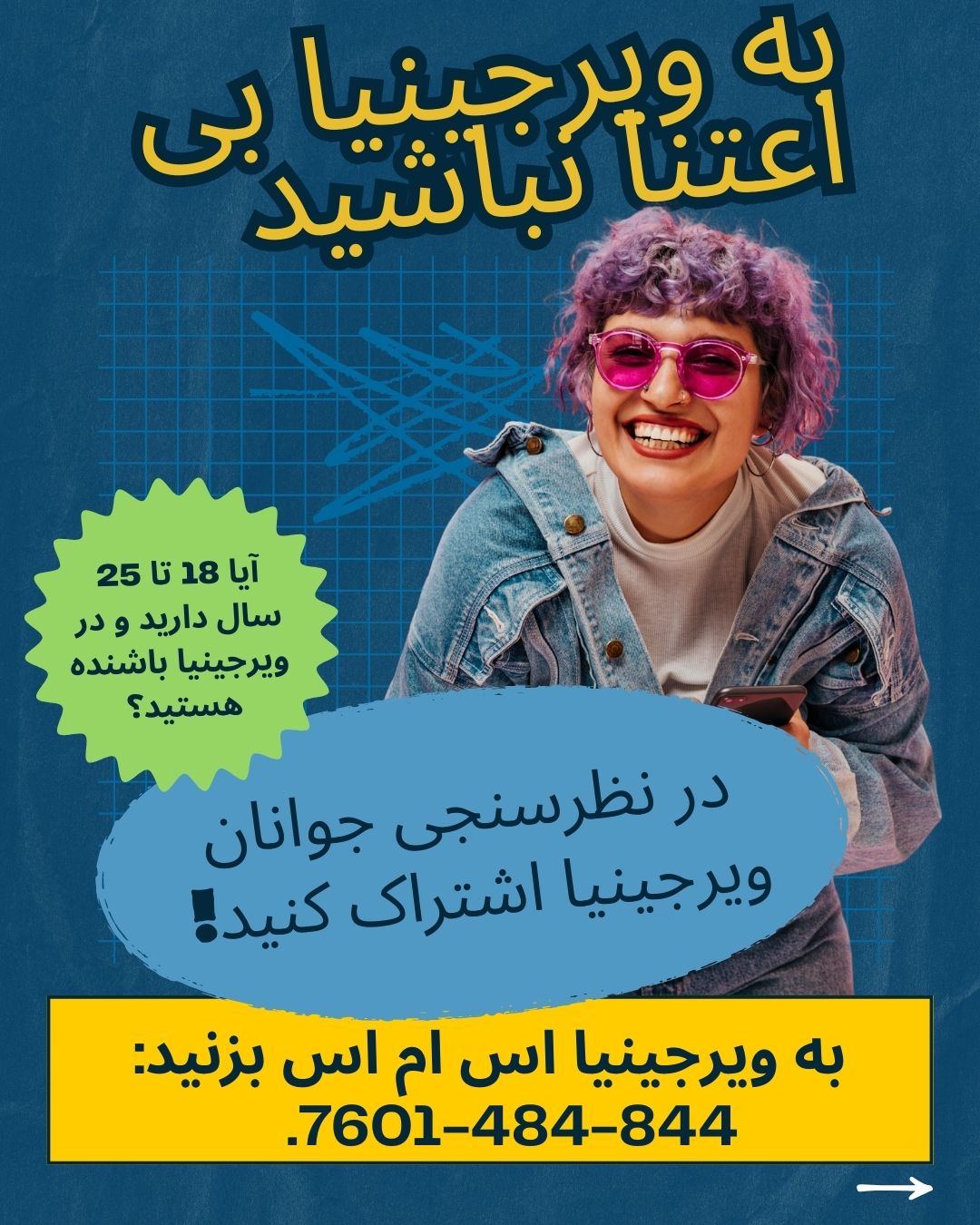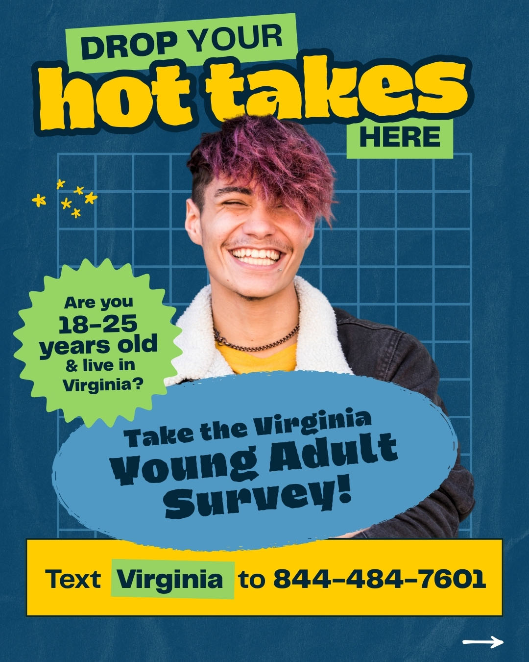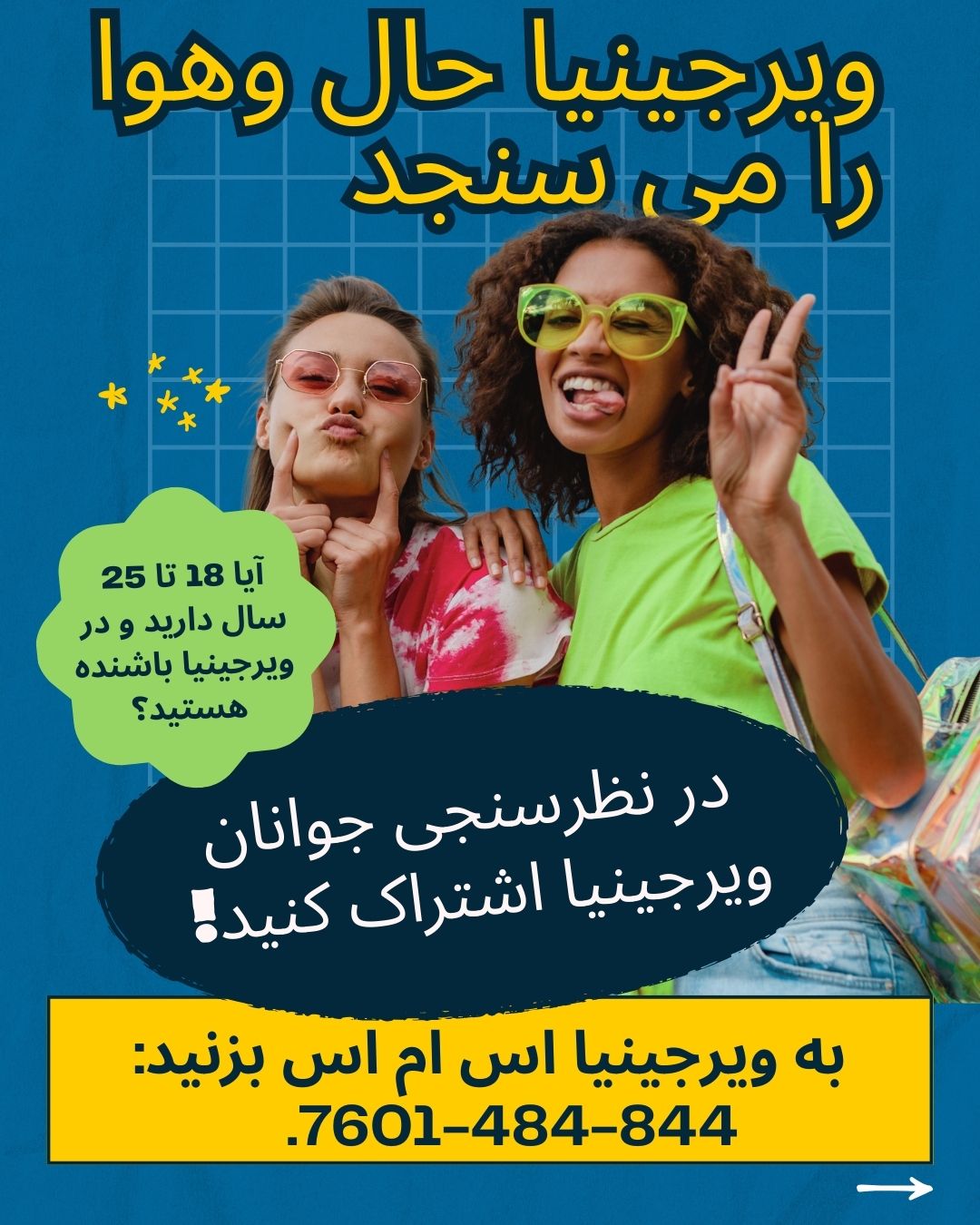 برای شرکت در نظرسنجی، باید بین 18 تا 25 سال سن داشته باشید و ساکن ایالت ویرجینیا باشید. برای اهداف این نظرسنجی، محصلینی که در کالجها و دانشگاه های ایالت ویرجینیا تحصیل میکنند، ساکنین ویرجینیا محسوب میشوند. هنگام شرکت در این نظرسنجی، از شما خواسته می شود که کاونتی یا محل را که در آن زندگی می کنید انتخاب کنید.