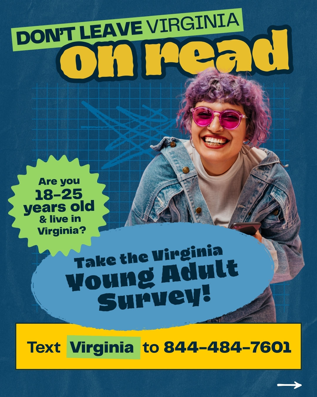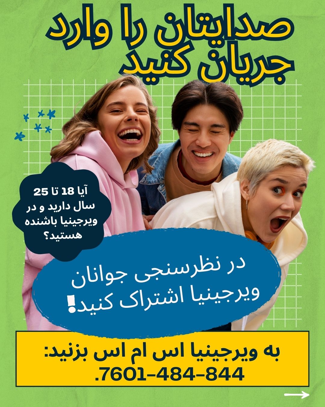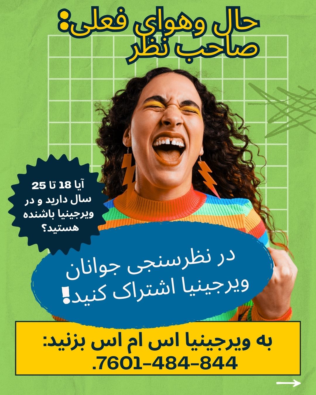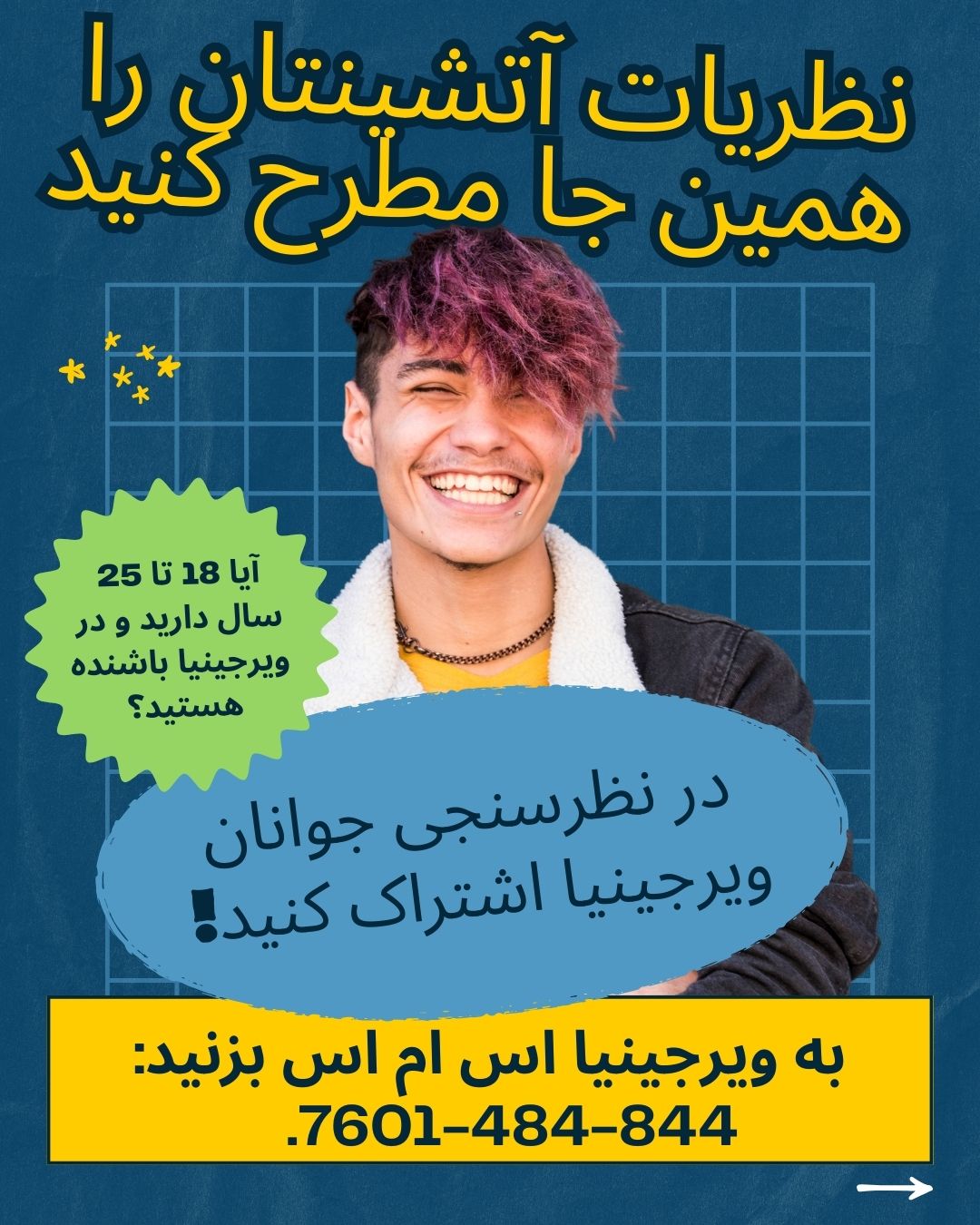 برای شرکت در نظرسنجی، باید بین 18 تا 25 سال سن داشته باشید و ساکن ایالت ویرجینیا باشید. برای اهداف این نظرسنجی، محصلینی که در کالجها و دانشگاه های ایالت ویرجینیا تحصیل میکنند، ساکنین ویرجینیا محسوب میشوند. هنگام شرکت در این نظرسنجی، از شما خواسته می شود که کاونتی یا محل را که در آن زندگی می کنید انتخاب کنید.