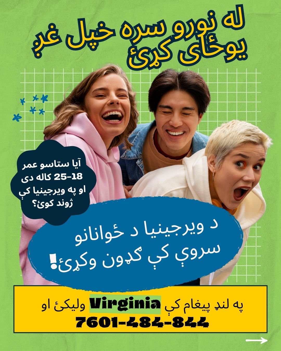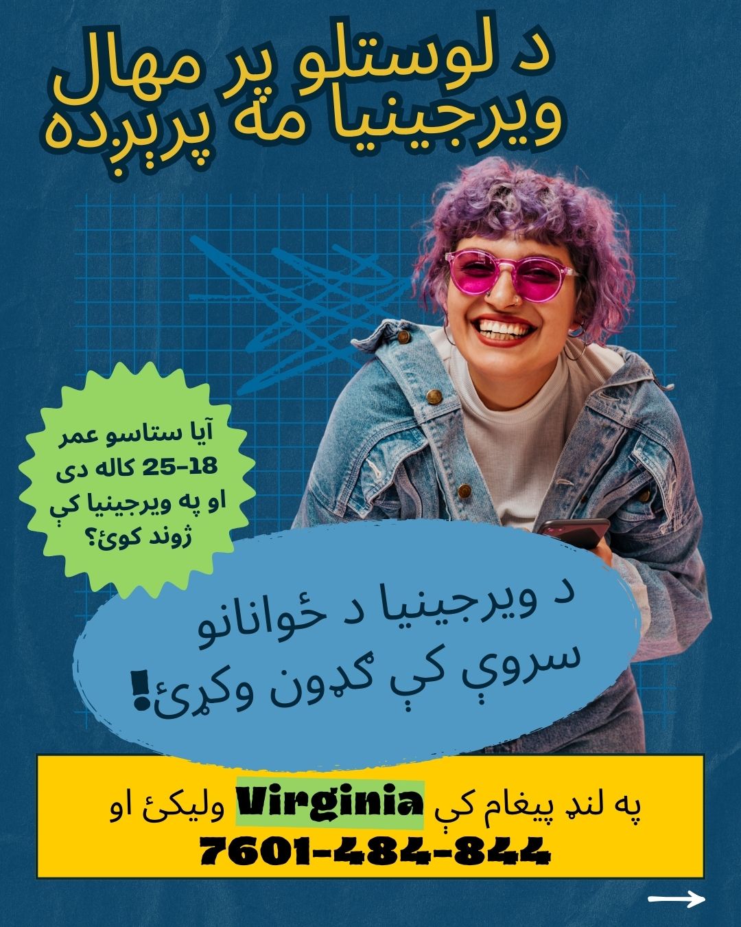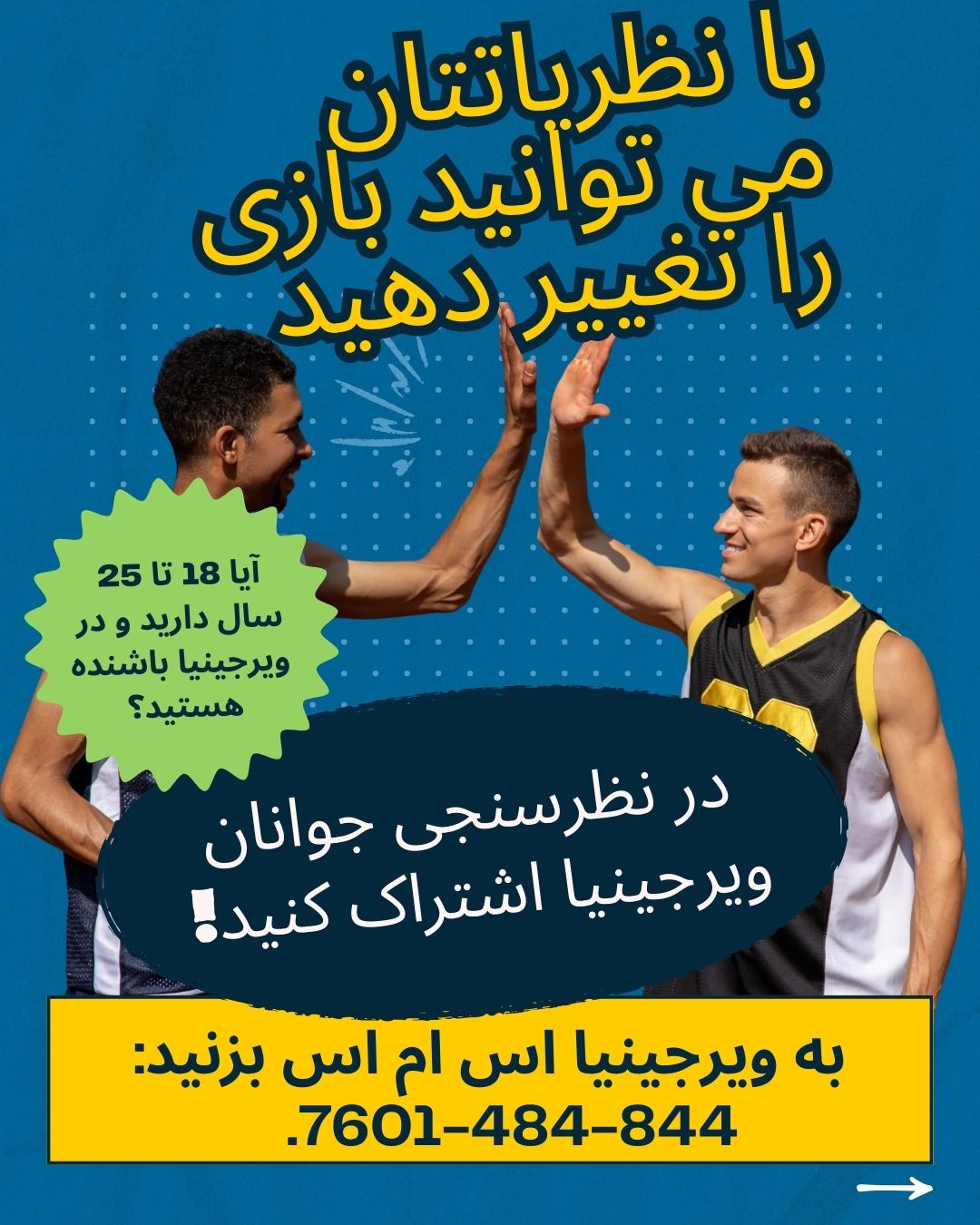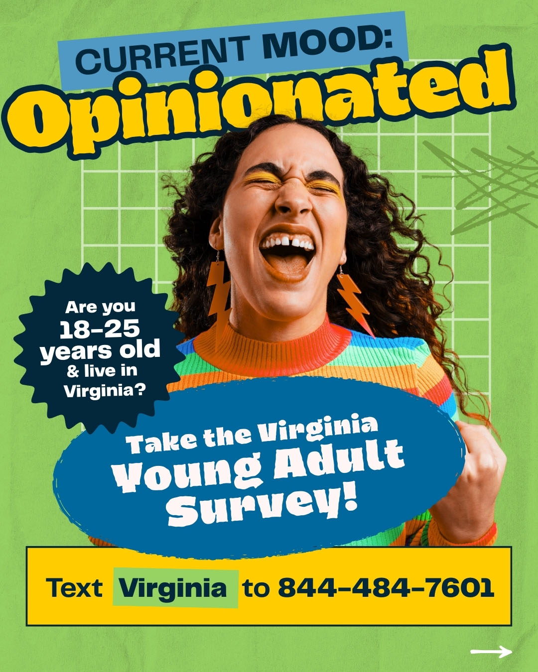 برای شرکت در نظرسنجی، باید بین 18 تا 25 سال سن داشته باشید و ساکن ایالت ویرجینیا باشید. برای اهداف این نظرسنجی، محصلینی که در کالجها و دانشگاه های ایالت ویرجینیا تحصیل میکنند، ساکنین ویرجینیا محسوب میشوند. هنگام شرکت در این نظرسنجی، از شما خواسته می شود که کاونتی یا محل را که در آن زندگی می کنید انتخاب کنید.