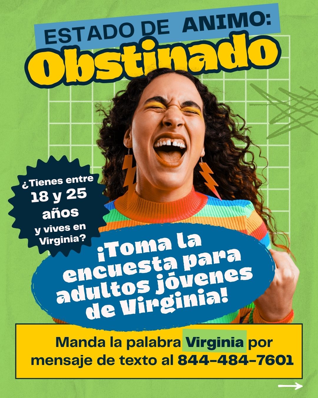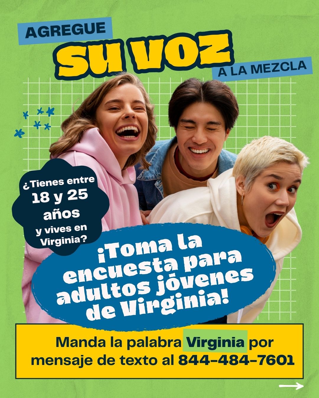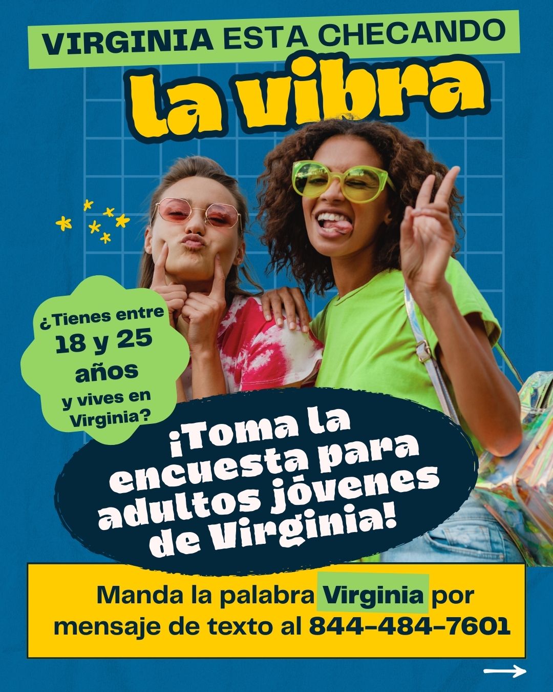 Para realizar la encuesta, debe tener entre 18 y 25 años de edad y ser residente de la Mancomunidad de Virginia. Los estudiantes que asisten a colegios y universidades en el estado de Virginia se consideran residentes de Virginia para los fines de esta encuesta. Al realizar esta encuesta, se le pedirá que seleccione el condado o la localidad en la que vive.