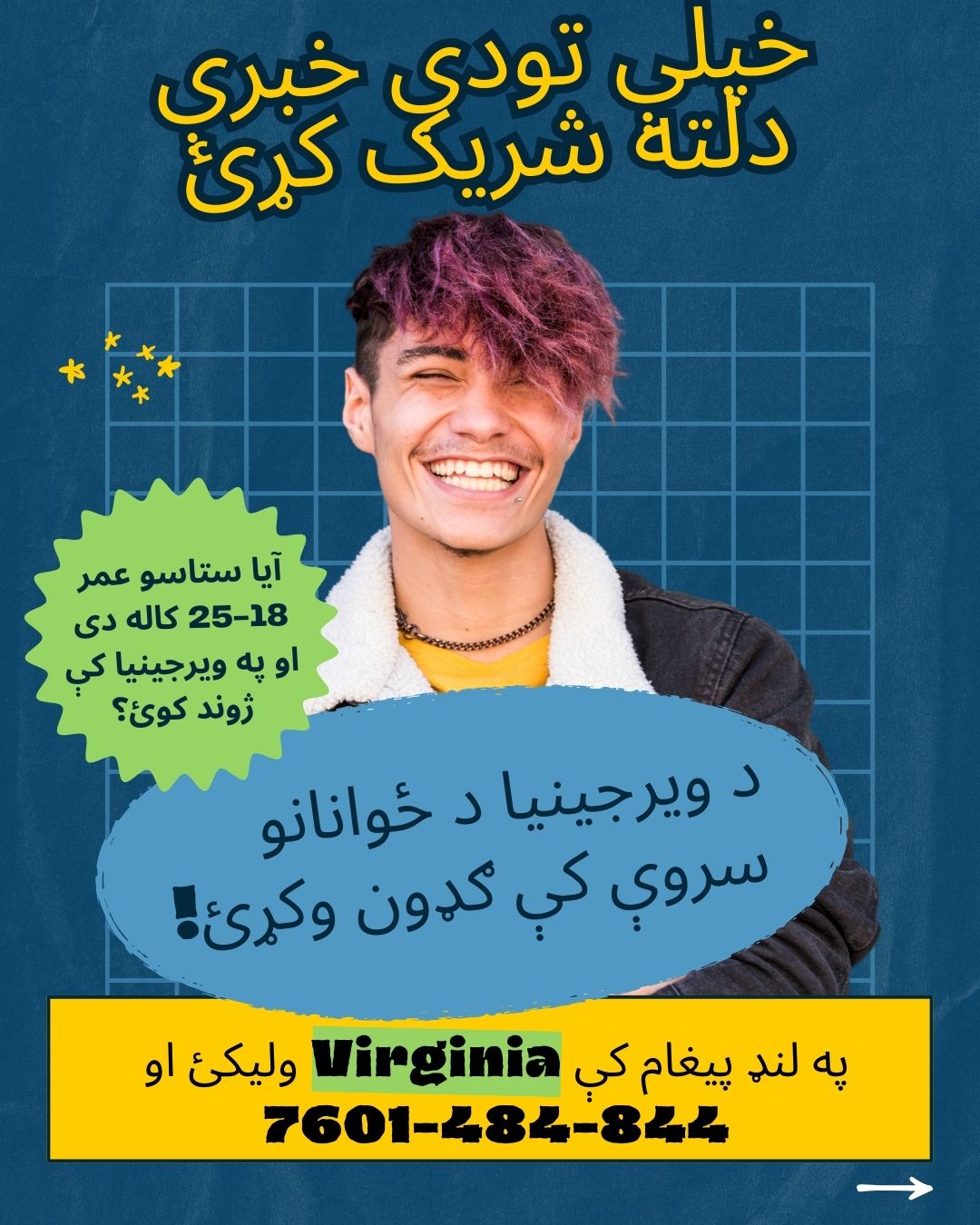 د دې لپاره چې په سروې کې ګډون وکړئ، ستاسو عمر باید د 18 او 25 کلونو تر منځ وي او د ویرجینیا د مشترک المنافعو اوسیدونکي یاست. هغه زده کوونکي چې په ویرجینیا کې پوهنتون یا کالج لولي د دې سروې لپاره د ویرجینیا اوسیدونکي ګڼل کېږي. کله چې په دې سروې کې ګډون کوئ، نو له تاسو څخه به غوښتنه وشي چې هغه ولسوالۍ وټاکئ چې تاسو ژوند پکې کوئ.